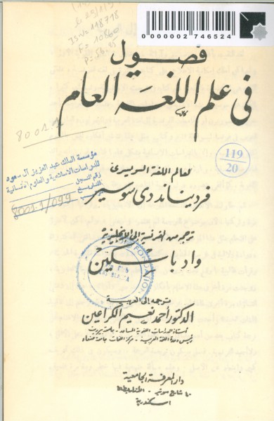 فصول في علم اللغة العام [نص مطبوع] / فرديناند دي سوسير ؛ ترجمه من الفرنسية إلى الإنجليزية واد باسكين ؛ ترجمه [عن الإنجليزية] إلى العربية أحمد نعيم الكراعين